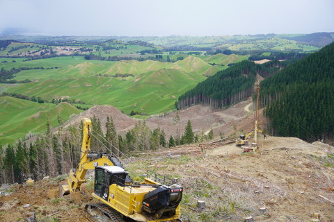 PAN PAC社は、ホークス・ベイのフィリナキ(ネイピア近郊)を拠点とする林産・パルプ・製材メーカーで、林業事業から木材加工、パルプ生産までを一貫して手がけています。1971年の創業以来約50年間、地域林産業を支え、現在は日本の紙パルプ業界最大手の完全子会社として事業を展開しています。原料の多くに成長の早いラジアータ・パインを用い、年間約150万tの丸太、約53万㎥の製材、約27万tのパルプを生産・輸出しています。苗木の植栽から始まる持続可能な森林管理を徹底し、ホークス・ベイ地域最大の山林事業者として、従業員、請負業者それぞれ400人以上を擁しているそうです。自社森林(総面積3万7千ha)からは木材・パルプの約45%を供給し、伐採サイクルは約28~30年で、年間約1,000haを伐採・植え替えしています。
