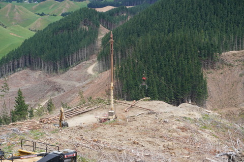 近年の伐採現場ではワイヤーサポートによるテザーシステム伐採が導入され、伐採作業の安全性向上に大きく貢献しています。テザー伐採は急傾斜地で作業員が地上に立つことによるリスクを軽減する手法で、現在は35~45度の斜面でも活用され、全体の95%以上が機械伐採で行われています。